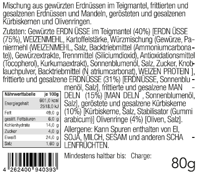 • Tom’s Mafia Snack (80 g) – eine Gangster-Mischung: Erdnüsse im Teigmantel, frittierte Erdnüsse, Mandeln, gesalzene Kürbiskerne und Olivenringe. Knuspern auf höchstem Niveau