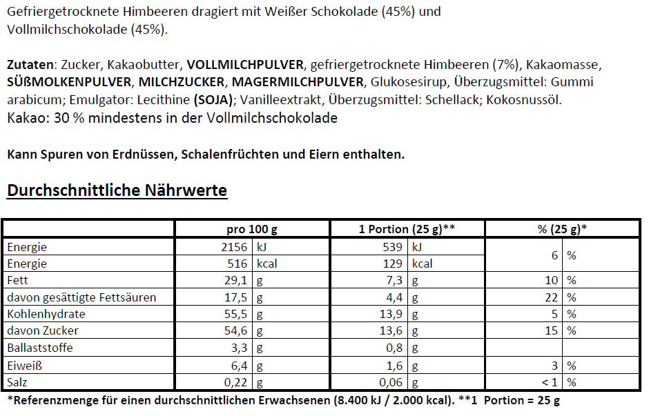 Erlebe puren Genuss mit unseren knusprigen Himbeeren in Schokolade – gefriergetrocknete Himbeeren, doppelt dragiert mit zarter weißer Schokolade (45 %) und feinster Vollmilchschokolade (45 %). Die Kombination aus fruchtiger Frische, sanfter Süße und knuspriger Textur macht jeden Bissen zu einem kleinen Glücksmoment.